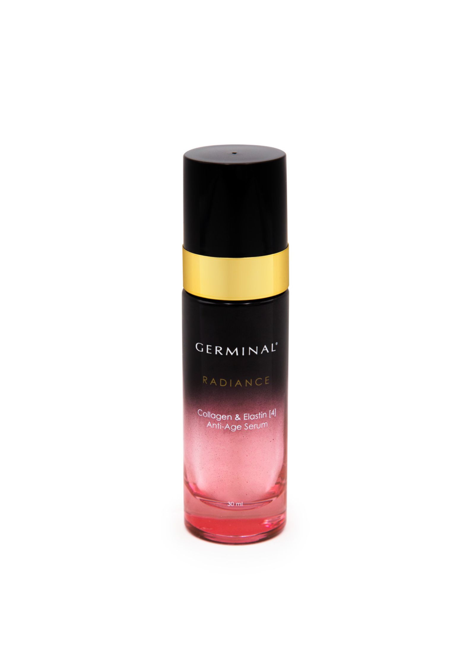 El Germinal Radiance Collagen & Elastin Anti-Age Serum es un sérum antiedad que contiene 4 tipos de colágeno y elastina, proporcionando una ultra firmeza y elasticidad. Está indicado para todo tipo de pieles a partir de 40 años y es ideal para quienes se preocupan por el envejecimiento prematuro de la piel, así como por la falta de firmeza y elasticidad. Este sérum aumenta la firmeza y la elasticidad de la piel, evitando la flacidez y el descolgamiento. Además, estimula y genera colágeno, estabilizando el colágeno existente.